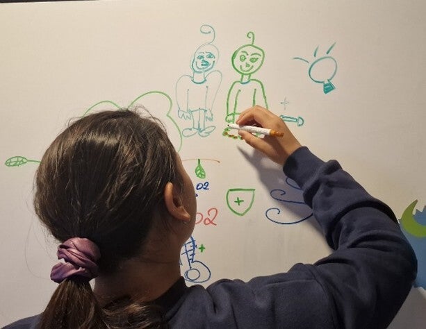 Nous avons parcouru les différentes parties ensemble, et à chaque fois, l’enfant a dessiné ce qu’il comprenait — en transformant la théorie en images et en sens.
